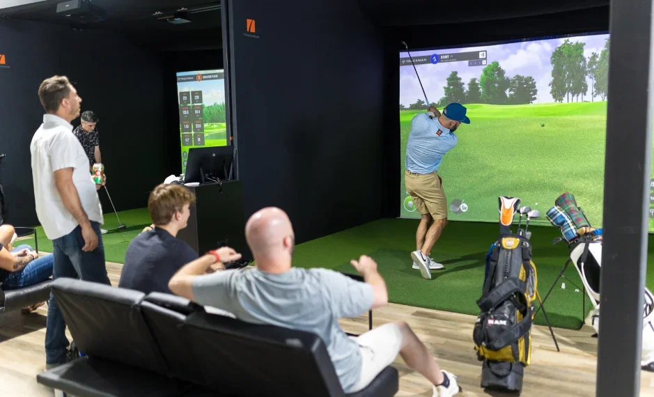Golf Simulator: Men playing indoor golf on a simulator with a large screen displaying a golf course.