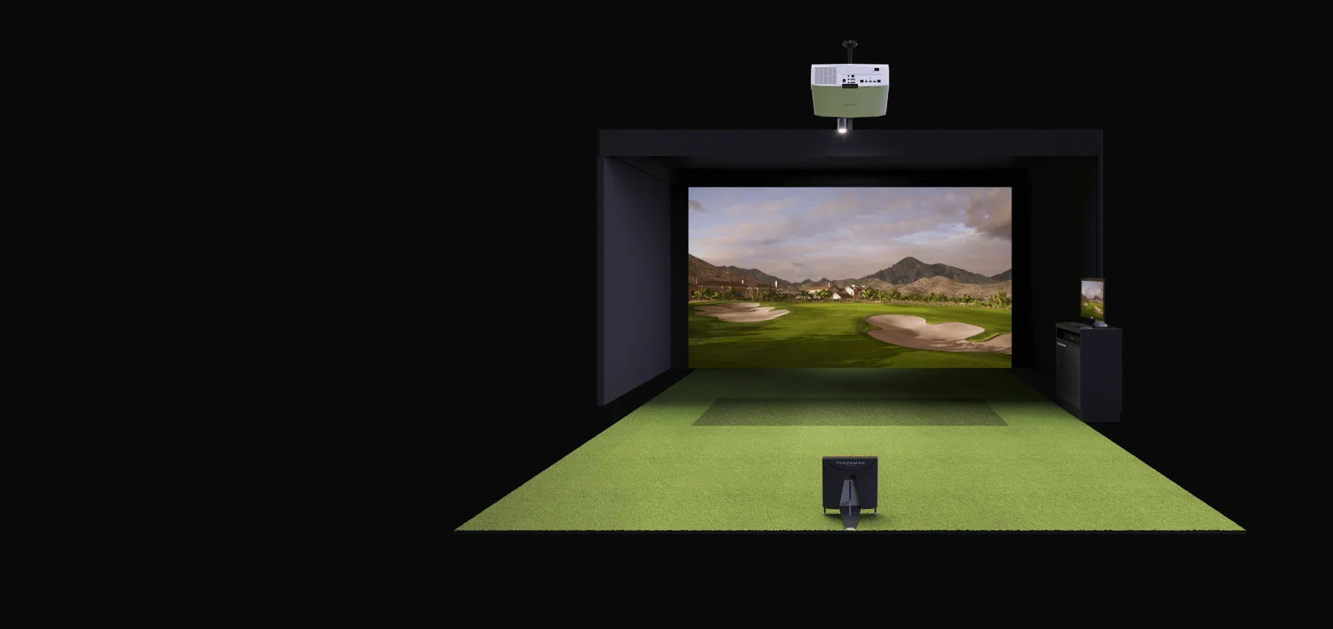 Golf Simulator: Indoor golf simulator with a screen displaying a golf course, a golf mat with a tee, and a launch monitor.